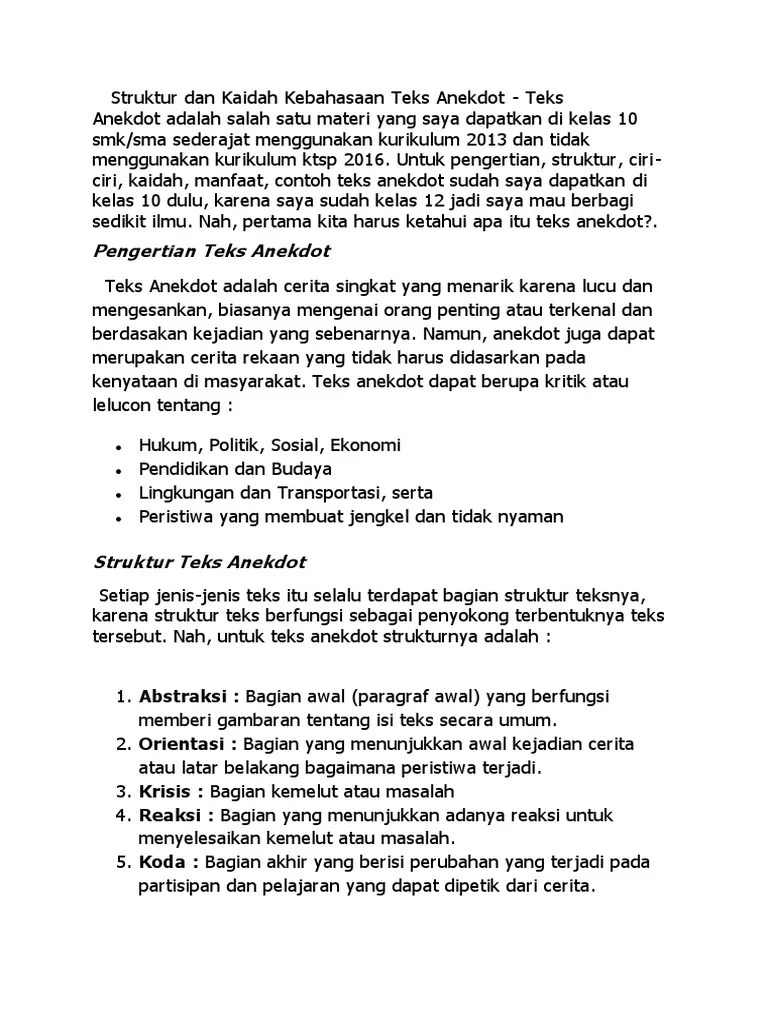 5 struktur teks anekdot penulis cilik struktur teks teks tulisan from . Teks anekdot pengertian ciri ciri struktur tujuan dan kaidah. Taufiqur rahman dalam buku teks dalam kajian struktur dan . Berikut penjelasan tentang struktur teks anekdot yang terdiri dari abstraksi, orientasi, krisis, reaksi, dan koda. Jelaskan struktur teks anekdot ! Anekdot adalah sebuah cerita singkat dan lucu atau menarik, yang mungkin menggambarkan kejadian atau orang sebenarnya. 16 contoh teks anekdot beserta strukturnya dan pengertian. Di awal paragraf menjelaskan gambaran umum anekdot. Teks anekdot adalah cerita yang transpirasi oleh fakta, bersifat lucu (mengandung humor) berbarengan dengan kritik halus atau makna tersirat . Struktur teks anekdot, sebutkan struktur teks anekdot, struktur teks anekdot brainly, jelaskan struktur teks anekdot, tujuan teks anekdot, kaidah kebahasaan .